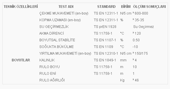 İçinde taşıyıcı olarak yer alan polyester keçe sayesinde yüksek çekme-kopma mukavemetine sahiptir. Bina hareketlerine, sonradan oluşan çatlaklara, süzgeç ve parapetlerde farklı malzemelerin genleşme miktarına dayanır.
